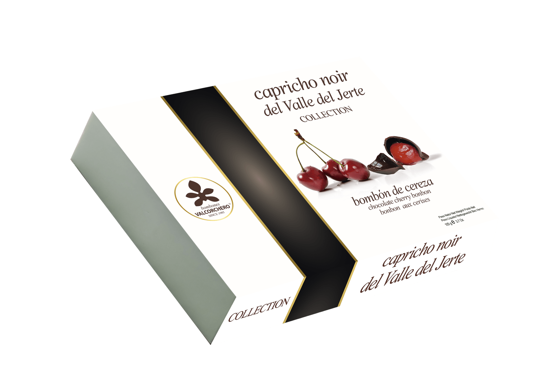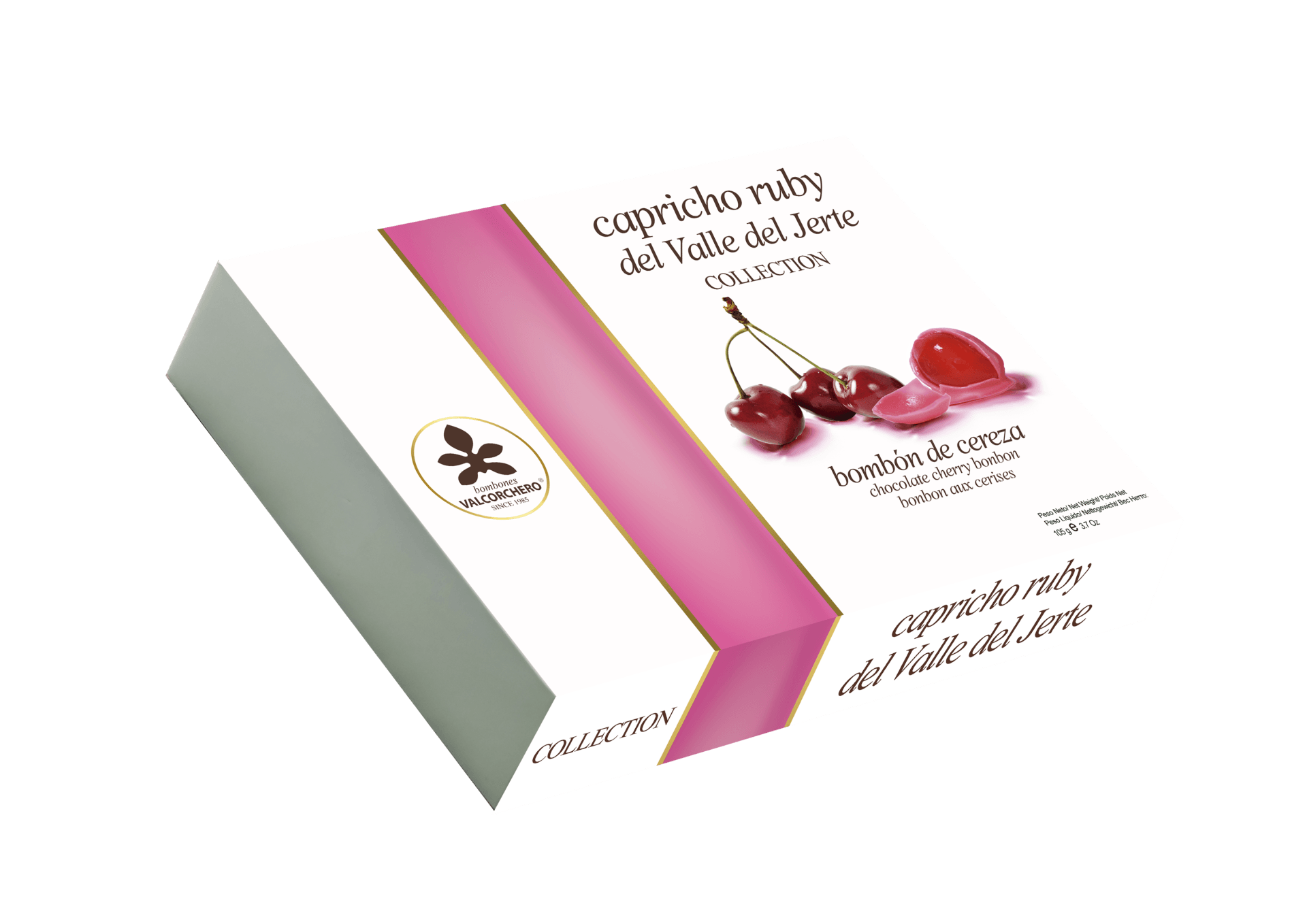 Goditi il Capricho del Valle del Jerte, un'autentica prelibatezza trasformata in squisiti cioccolatini alla ciliegia con cioccolato fondente, bianco e rubino che vengono presentati in una custodia perfetta sia per i regali che per il piacere.